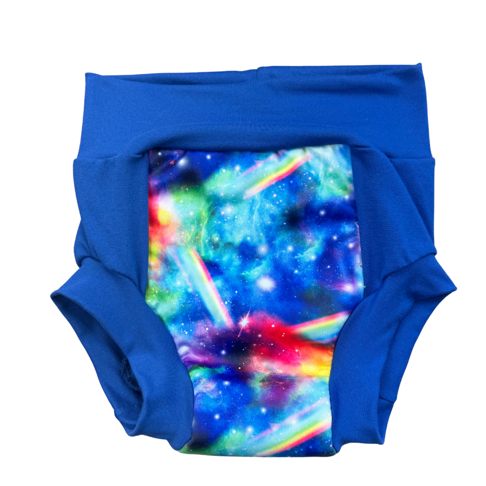 The Nighttime Trainer features 4 super absorbent layers of bamboo fabric in the wet zone and a waterproof layer to prevent puddles, the perfect combination for children new to potty learning or those that need a little nighttime protection. The stretchy waist and legs allow your child to easily pull the trainer up & down on their own, giving them confidence and independence in this new stage of their life. The natural fiber interior allows your child to instantly feel when they have had an accident which will help them better understand when they need to use the toilet.